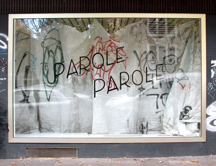 Coco Bergholm / 2017 / PAROLE PAROLE / acrylic on window, found painted plastic foil / aprox. 5x3m
