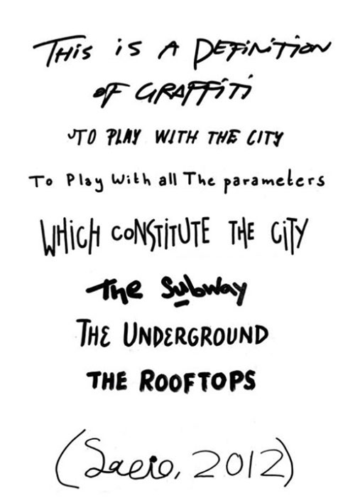 Bis zu seinem frühen Tod mit nur 29 Jahren stellte der Pariser Künstler SAEIO konsequent und humorvoll die Grenzen der Stadt auf den Prüfstand. Er verstand Graffiti als eine strukturelle Interaktion mit den Oberflächen der Stadt, dessen Akt vom Raum, Zeit und vom eigenen Körper bestimmt werden. Mehr als andere Formen der Malerei zeichnet sich Graffiti durch nicht kontrollierbare Anteile aus, die mit seinem illegalen Status aber auch mit den unvorhersehbaren Situationen im öffentlichen Stadtraum einhergehen. Die Zufälligkeit der Straße, das spontan-experimentelle Handeln "in situ" und das unmittelbare in Kontakt treten mit der Stadt gaben SAEIOs künstlerische Praxis ihren performativen Charakter, der weit über eine Geste hinaus reicht.